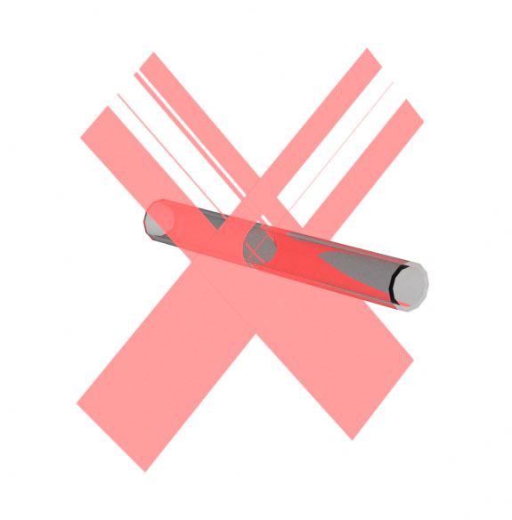 Dual-Axis, glass, transparent, and translucent—measure clear or translucent part diameter from two viewpoints, just as accurately as diameter of an opaque part. The two diameter measurements are coplanar and perpendicular to each other. With such products, laser light can bleed through the part making it appear to the system that there is more than one part present. In the illustration, one or two extra segments of light are shown bleeding through the part in each axis. Systems without proper hardware and software report this condition as an error. However, all of LaserLinc’s systems include the proper hardware and software, at no charge, so they are able to report accurate measurements and ignore any laser light that may bleed through the product. Note: any of the measurements shown for dual-axis may be applied to clear and translucent products. |