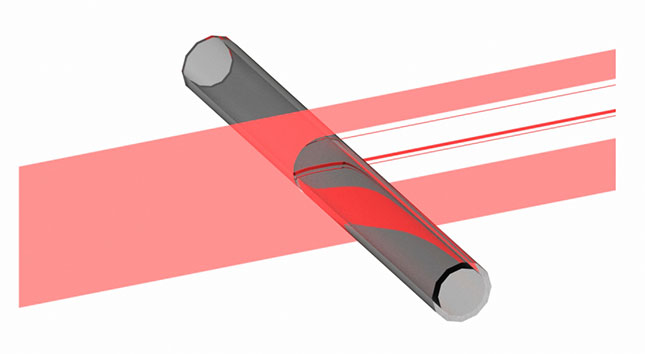 Single-axis, glass, transparent, and translucent—measure the diameter of a clear or translucent part just as accurately as diameter of an opaque part. With such products, laser light can bleed through the part making it appear to the system that there is more than one part present. In the illustration, several extra segments of light are shown bleeding through the part. Systems without proper hardware and software report this condition as an error. However, all of LaserLinc’s systems include the proper hardware and software, at no charge, so they report accurate measurements and ignore any laser light that may bleed through the product. Note: all of the measurements shown for single-axis may be applied to clear and translucent products. |