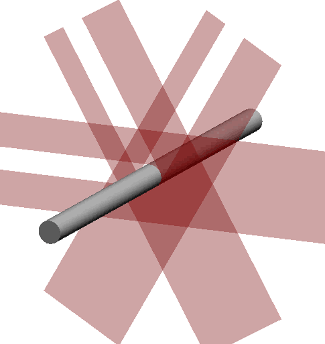 Triple-axis, position—measure the position of the center of a single part relative to the center of the laser field, in each of three intersecting, coplanar, laser fields. The laser fields are separated by 60 degrees from each other. |