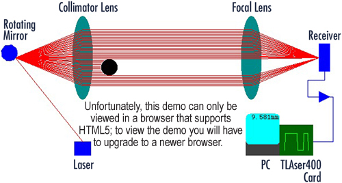 Optics in the receiver collect the unobstructed laser light and focus it on a photocell. The output of the photocell is analyzed by electronics to detect the precise time at which the laser crosses each part edge. Software converts timing data into meaningful measurements.