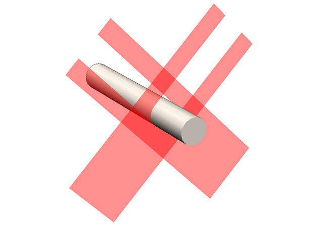 ![]() Dual-Axis, outside diameter—measure the diameter of a single part from two viewpoints. The two measurements are coplanar and perpendicular to each other. The average of and difference between the two measurements are also calculated. |