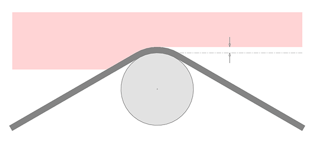 Single-axis, sheet/film thickness over a roller—measure thickness indirectly by comparing the edge position measurement while the product is passing over the reference roller to a stored “reference” edge position measurement. The reference measurement is made with only the roller in place (represented by the dashed line). |