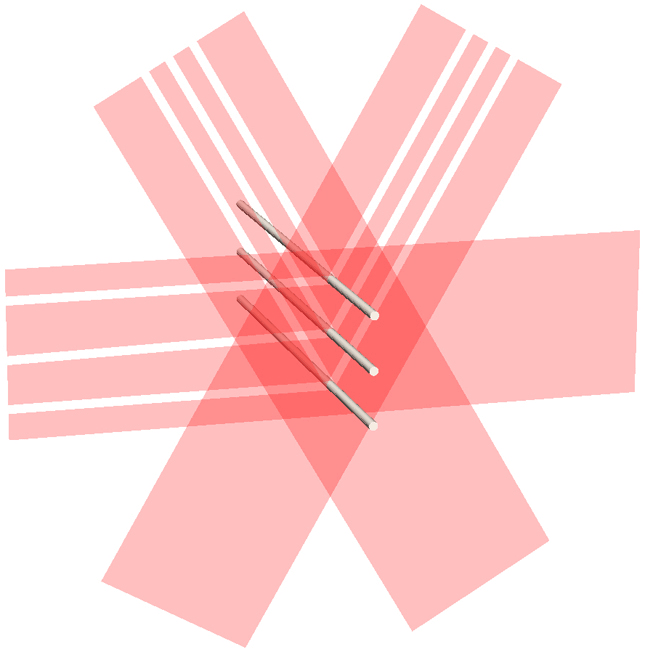 Triple-axis, multi-part—simultaneously measure the diameter and position of each part from three viewpoints. The three axes of measurement are coplanar and are separated by 60 degrees from each other. Multi-part measurement requires that laser light, in each axis, pass above and below each part. The number of parts that can be measured at once is not limited by software. Read more here. |