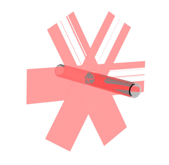Triple-Axis, glass, transparent, and translucent—measure clear or translucent part diameter from three viewpoints, just as accurately as diameter of an opaque part. The three diameter measurements are coplanar and are separated by 60 degrees from each other. With such products, laser light can bleed through the part making it appear to the system that there is more than one part present. In the illustration, extra segments of light are shown bleeding through the part in each axis. Systems without proper hardware and software report this condition as an error. However, all of LaserLinc’s systems include the proper hardware and software, at no charge, so they are able to ignore the light bleeding through the product and report accurate measurements. Note: any of the measurements shown for triple-axis may be applied to clear and translucent products. |
